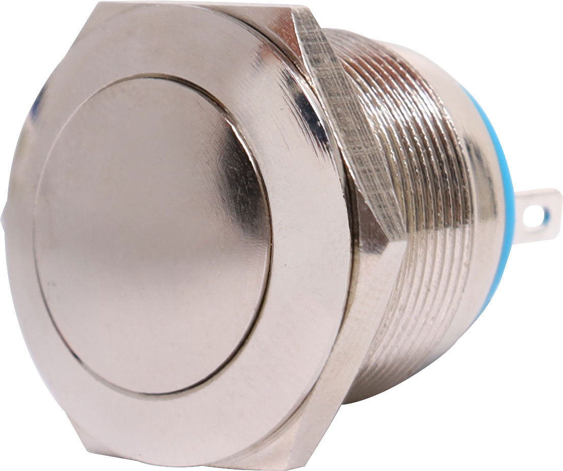 Heavy duty vandal resistant switch with solder terminal tags on rear for indoor/ sheltered outdoor use eg carparks, building entrances. Momentary.