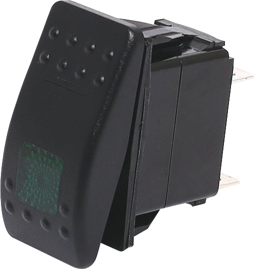 A marine/boat style flat rocker switch suitable for use in 12V DC or 24V DC power systems. IP66 rated weatherproof design with green 12V/24V DC neon illumination. Suits panel thicknesses up to 4mm. Panel Cutout: 21 x 38.5mm approx. Will vary with panel thickness.