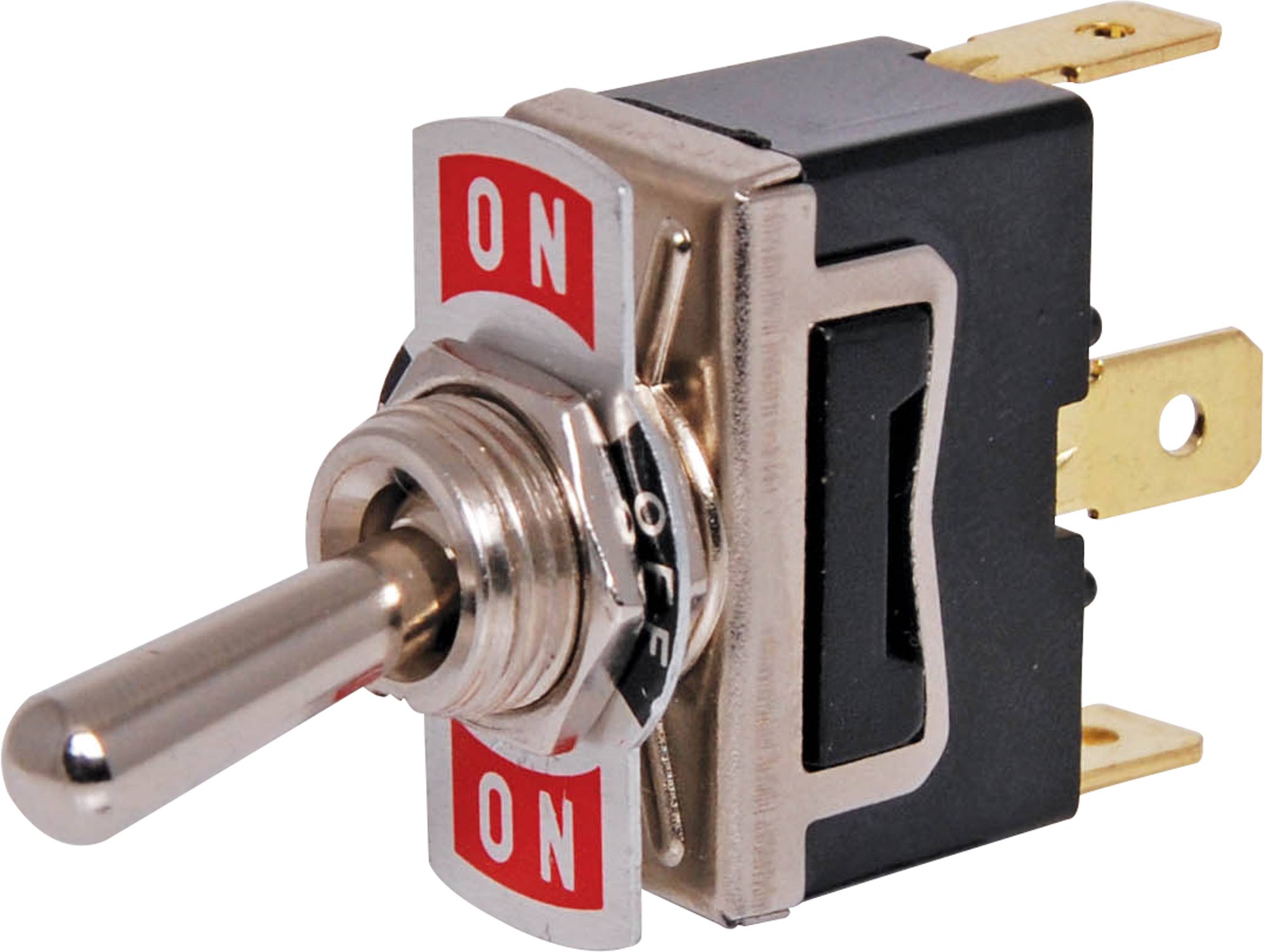 A single pole, dual throw switch with a center ''OFF'' position and a latching ''ON'' position and a momentary ''ON'' position.