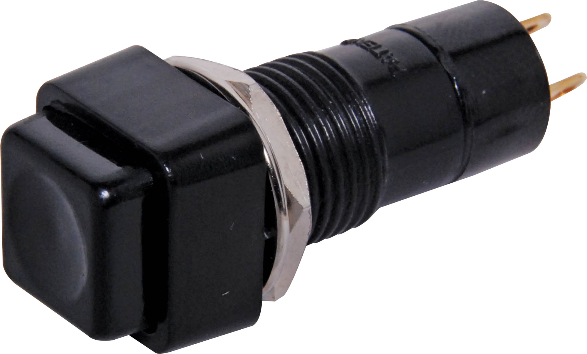Popular square bodied panel mount push button switch with black cap and momentary operation.