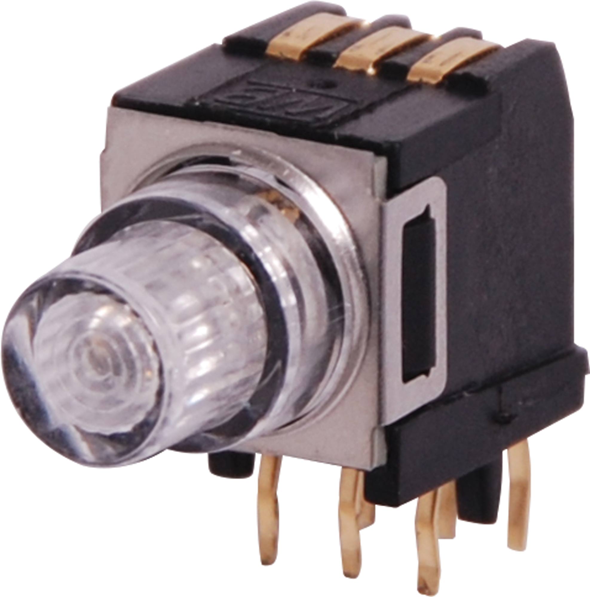 SPST tactile switch with LED and round actuator. Clear plastic diffuses LED light output. 90°. Green. Dimensions: