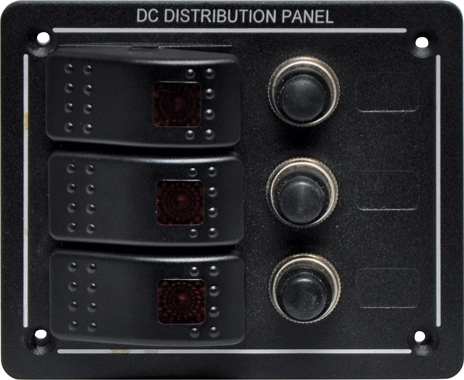 Switch all your gear on and off with this handy power control plate for cars, caravans and 4wDs. 3 x 20A 12V DC rated switches with red illumination. Individual 15A DC breakers. IP54 rated. Size: 114W x 96H x 60Dmm.