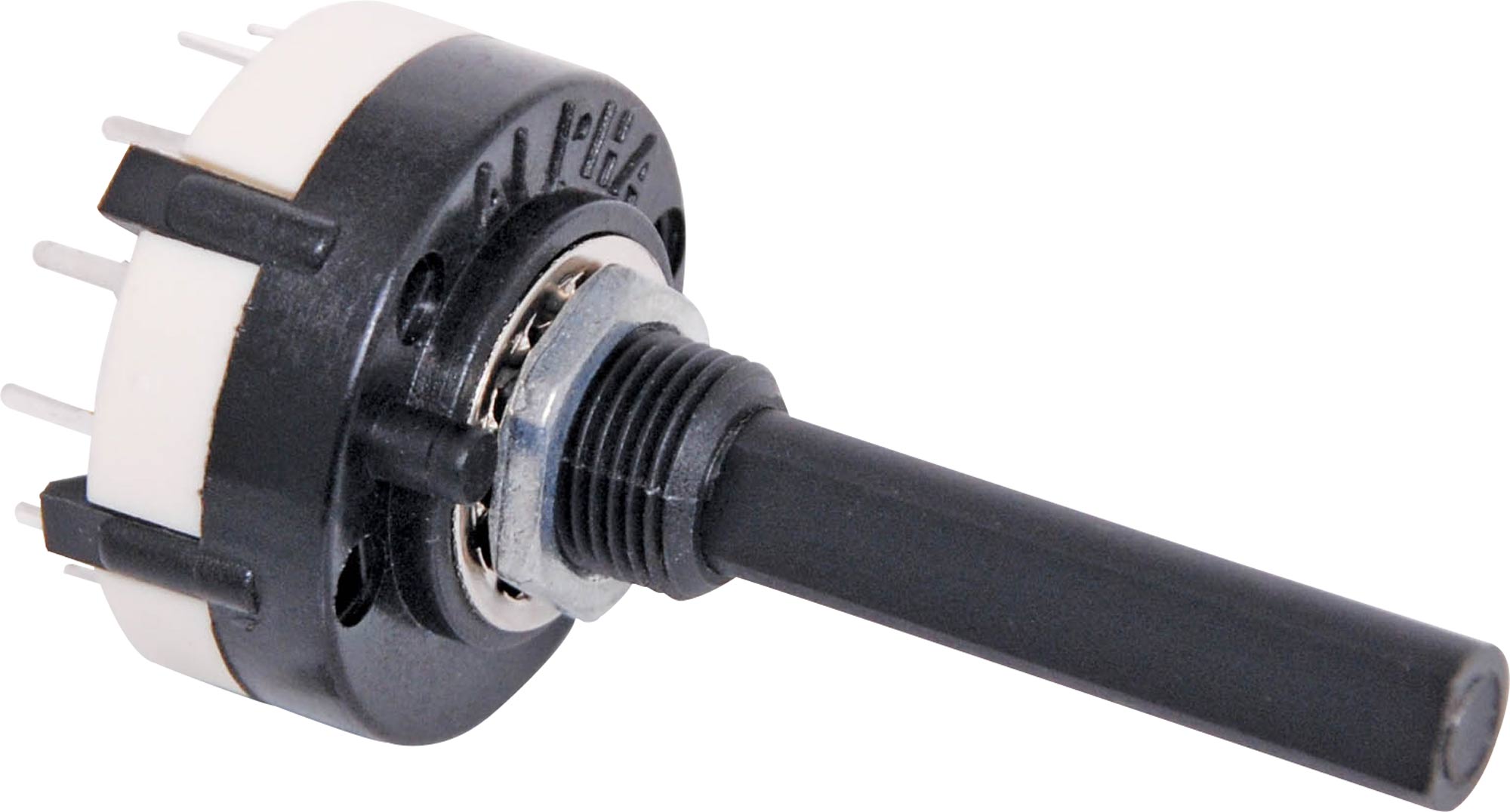 A configurable PCB mount rotary switch with 6.35mm D shaft. Each switch includes a toothed washer with a mating series of sockets in the switch housing to enable the switch to be configured to your specific requirement. This model can be configured for 3 pole, 2 position up to 3 pole 4 position. Note: This rotary switch is not compatible with H6020, H6022, H6024, H6028 and H6030 knobs. Diagram