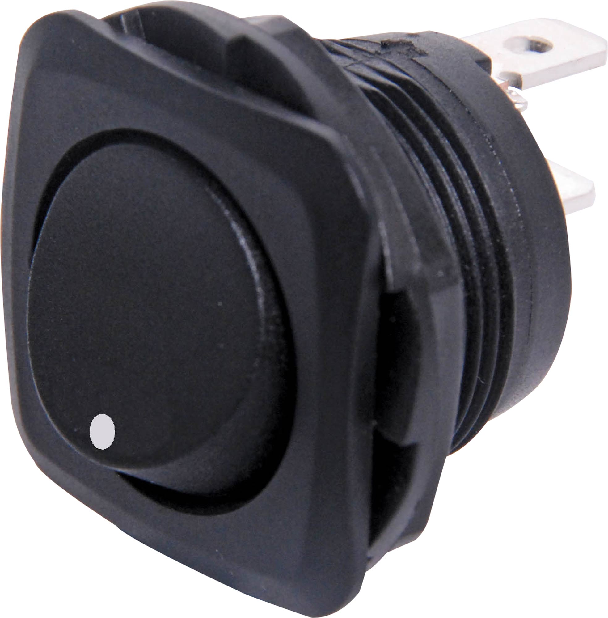 A stylish round panel mount SPST alternate rocker switch with a square facia. Low profile design protrudes just 3.5mm from the panel surface. Contact rating of 10A @ 250V AC.