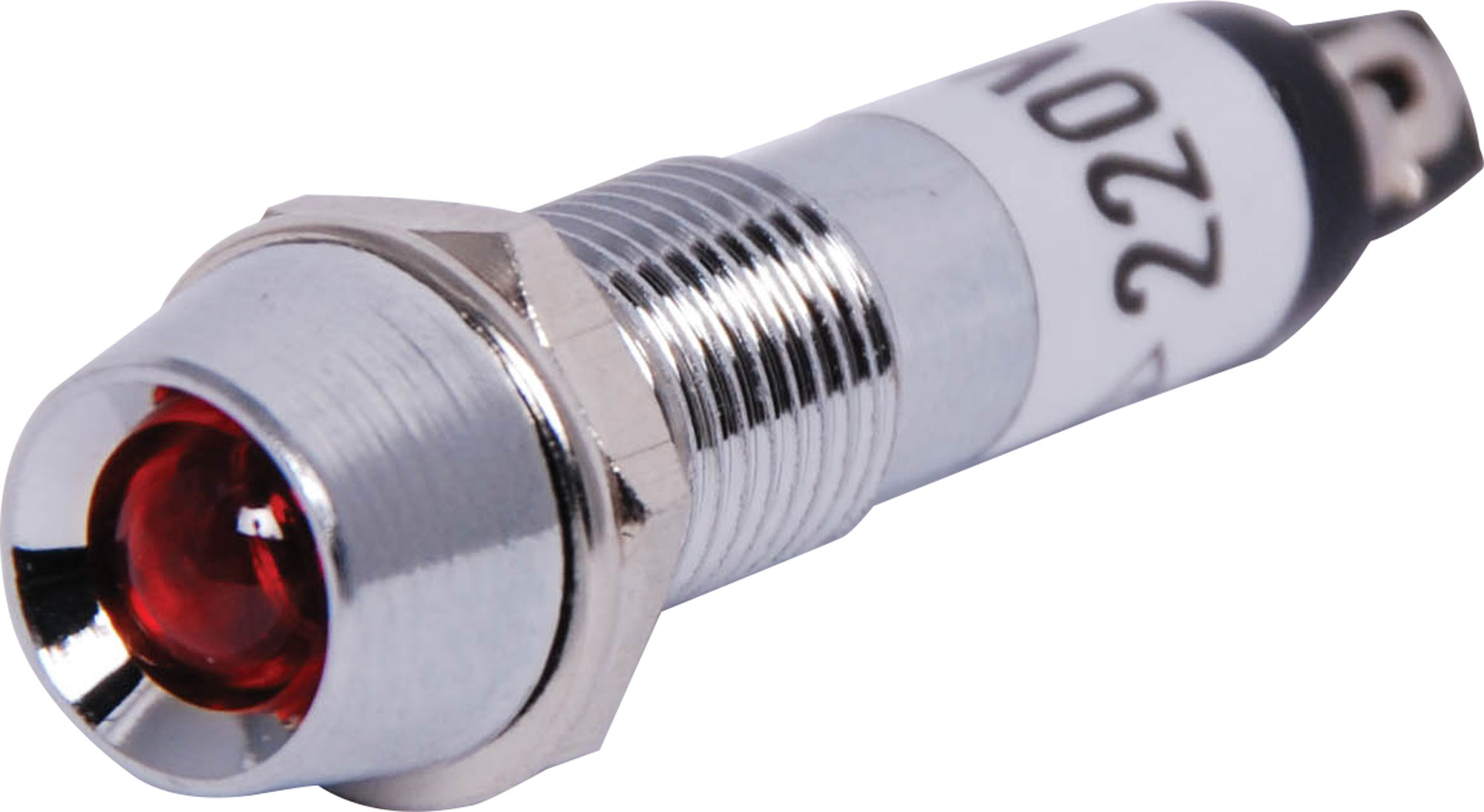 250V AC panel mount chrome bezel red neon. Mounting hole 8mm Ø.