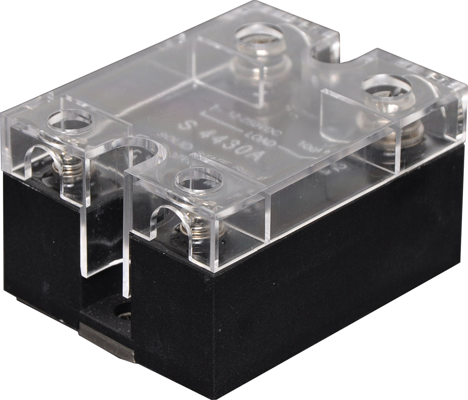 100A SPST relay. Solid state type. Switches DC only. 5-30V DC coil. No moving parts and no contact arcing. Features zero voltage turn on, zero current turn off.