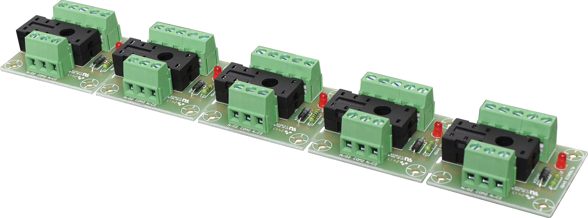 The S 4451 is a handy relay board suitable for 6V, 12V or 24V relays (available separately). Each relay operates independantly and two sets of changeover contacts are provided. It features a perforated PCB so individual relays can be "snapped off" easily.