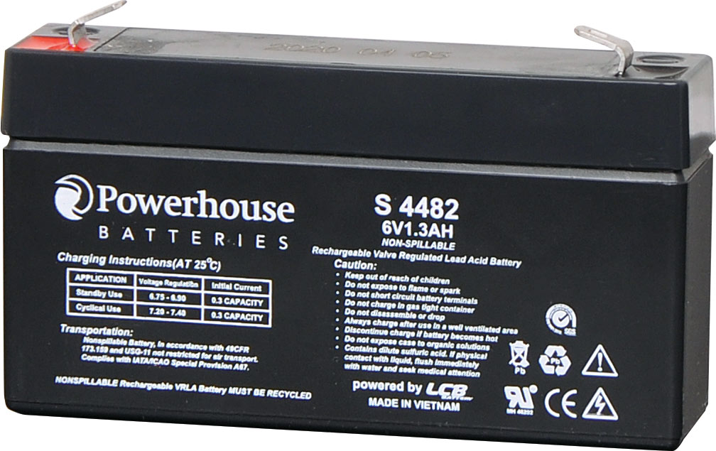 This 6V 1.3Ah sealed lead acid (SLA) battery is a compact battery for powering 6V equipment . It is commonly used in battery back up systems, alarm and communications systems and UPS units. Fitted with 4.8mm spade connection tabs, these batteries are easily user replaced in most equipment they are used in. Cells are fully sealed to prevent any leakage of electrolyte. UN Number: UN 2800 Non-Spillable - Hazard Class 8 ActivFire Listed (afp3824). Conforms to IEC 60896-21:2004 and IEC 60896-22:2004. Our range of Powerhouse SLA batteries are from a quality supplier and are graded for use in UPS systems. We have found the quality of SLA batteries varies considerably between suppliers and often cheaper units have a shorter life span. PLEASE NOTE: Excessive temperatures over 65ºC can effect the ABS housing. Need to be well ventilated in warm conditions. Not for use in engine bays.