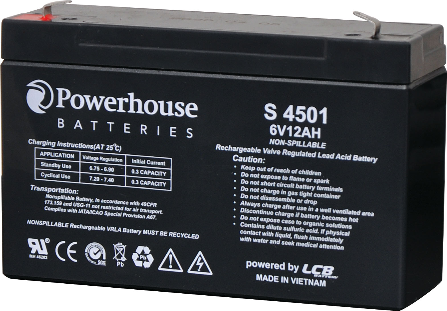 This 6V 12Ah sealed lead acid (SLA) battery is a compact battery for powering 6V equipment. It is commonly used in battery back up systems, alarm and communications systems and UPS units. Fitted with 4.8mm spade connection tabs, these batteries are easily user replaced in most equipment they are used in. Cells are fully sealed to prevent any leakage of electrolyte. UN Number: UN 2800 Non-Spillable - Hazard Class 8 ActivFire Listed (afp3824). Conforms to IEC 60896-21:2004 and IEC 60896-22:2004. Our range of Powerhouse SLA batteries are from a quality supplier and are graded for use in UPS systems. We have found the quality of SLA batteries varies considerably between suppliers and often cheaper units have a shorter life span. PLEASE NOTE: Excessive temperatures over 65ºC can effect the ABS housing. Need to be well ventilated in warm conditions. Not for use in engine bays.
