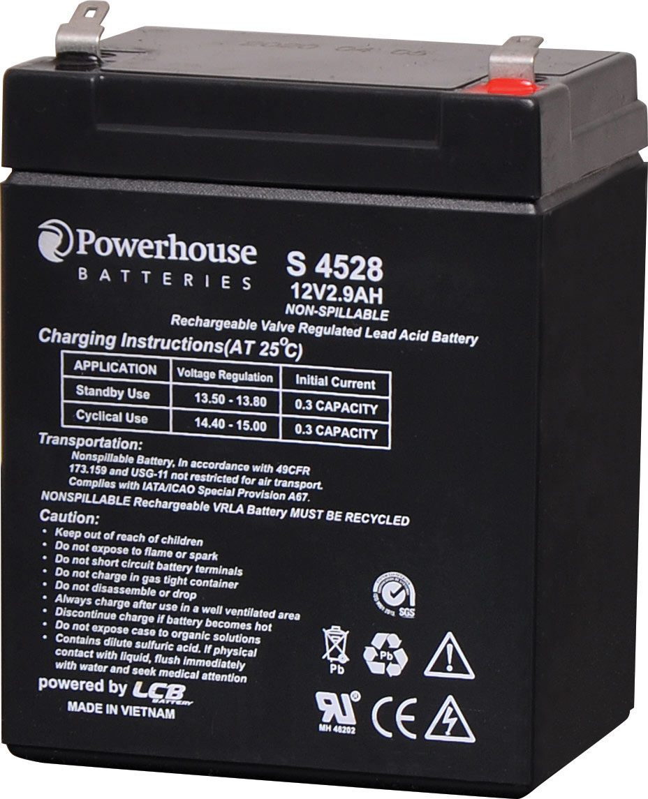 This 12V 2.9Ah sealed lead acid (SLA) battery is a compact battery for powering 12V equipment. It is commonly used in battery back up systems, alarm and communications systems and UPS units. Fitted with 4.8mm/F1 tab terminals, these batteries are easily user replaced in most equipment they are used in. Cells are fully sealed to prevent any leakage of electrolyte. UN Number: UN 2800 Non-Spillable - Hazard Class 8. ActivFire Listed (afp3824). Conforms to IEC 60896-21:2004 and IEC 60896-22:2004. Our range of Powerhouse SLA batteries are from a quality supplier and are graded for use in UPS systems. We have found the quality of SLA batteries varies considerably between suppliers and often cheaper units have a shorter life span. PLEASE NOTE: Excessive temperatures over 65ºC can effect the ABS housing. Need to be well ventilated in warm conditions. Not for use in engine bays.