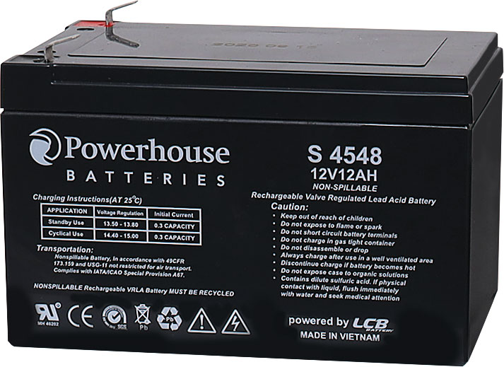 This 12V 12Ah sealed lead acid (SLA) battery is a compact battery for powering 12V equipment. It is commonly used in battery back up systems, alarm and communications systems and UPS units. Fitted with 6.3mm/F2 tab terminals, these batteries are easily user replaced in most equipment they are used in. Cells are fully sealed to prevent any leakage of electrolyte. UN Number: UN 2800 Non-Spillable - Hazard Class 8. ActivFire Listed (afp3824). Conforms to IEC 60896-21:2004 and IEC 60896-22:2004. Our range of Powerhouse SLA batteries are from a quality supplier and are graded for use in UPS systems. We have found the quality of SLA batteries varies considerably between suppliers and often cheaper units have a shorter life span. PLEASE NOTE: Excessive temperatures over 65ºC can effect the ABS housing. Need to be well ventilated in warm conditions. Not for use in engine bays.