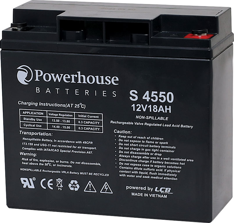 This 12V 18Ah sealed lead acid (SLA) battery is a compact battery for powering 12V equipment. It is commonly used in battery back up systems, alarm and communications systems and UPS units. Fitted with M6 bolt and nut terminals, these batteries are easily user replaced in most equipment they are used in. Cells are fully sealed to prevent any leakage of electrolyte. UN Number: UN 2800 Non-Spillable - Hazard Class 8. ActivFire Listed (afp3824). Conforms to IEC 60896-21:2004 and IEC 60896-22:2004. Our range of Powerhouse SLA batteries are from a quality supplier and are graded for use in UPS systems. We have found the quality of SLA batteries varies considerably between suppliers and often cheaper units have a shorter life span. PLEASE NOTE: Excessive temperatures over 65ºC can effect the ABS housing. Need to be well ventilated in warm conditions. Not for use in engine bays.
