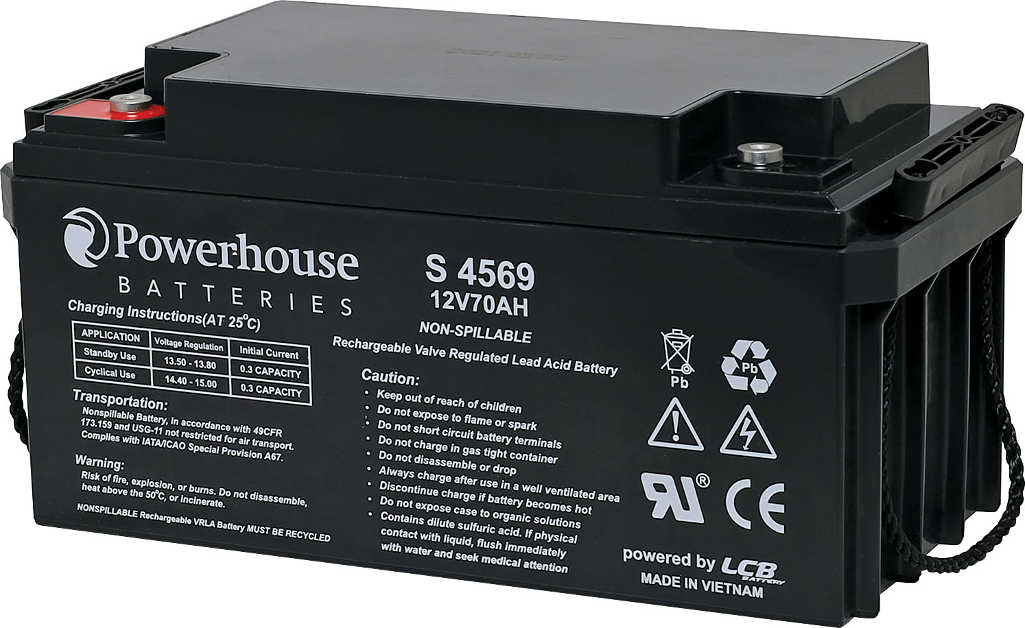 This 12V 70Ah sealed lead acid (SLA) battery is a compact battery for powering 12V equipment. It is commonly used in battery back up systems, alarm and communications systems and UPS units. Fitted with M6 bolt and nut terminals, these batteries are easily user replaced in most equipment they are used in. Cells are fully sealed to prevent any leakage of electrolyte. UN Number: UN 2800 Non-Spillable - Hazard Class 8. ActivFire Listed (afp3824). Conforms to IEC 60896-21:2004 and IEC 60896-22:2004. Our range of Powerhouse SLA batteries are from a quality supplier and are graded for use in UPS systems. We have found the quality of SLA batteries varies considerably between suppliers and often cheaper units have a shorter life span. PLEASE NOTE: Excessive temperatures over 65ºC can effect the ABS housing. Need to be well ventilated in warm conditions. Not for use in engine bays.