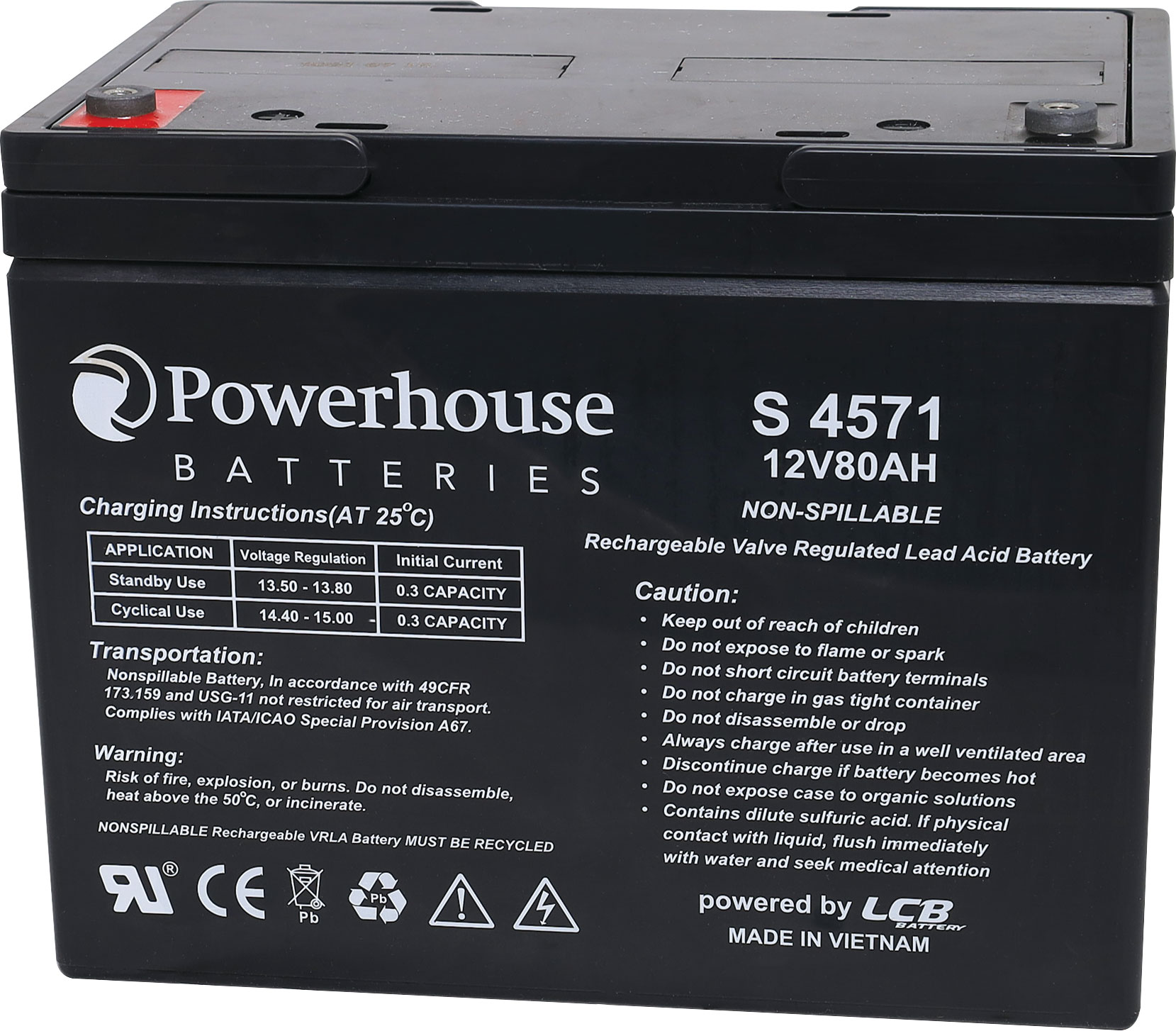 This 12V 80Ah sealed lead acid (SLA) battery is a compact battery for powering 12V equipment. It is commonly used in battery back up systems, alarm and communications systems and UPS units. Fitted with M6 bolt and nut terminals, these batteries are easily user replaced in most equipment they are used in. Cells are fully sealed to prevent any leakage of electrolyte. UN Number: UN 2800 Non-Spillable - Hazard Class 8. ActivFire Listed (afp3824). Conforms to IEC 60896-21:2004 and IEC 60896-22:2004. Our range of Powerhouse SLA batteries are from a quality supplier and are graded for use in UPS systems. We have found the quality of SLA batteries varies considerably between suppliers and often cheaper units have a shorter life span. PLEASE NOTE: Excessive temperatures over 65ºC can effect the ABS housing. Need to be well ventilated in warm conditions. Not for use in engine bays.
