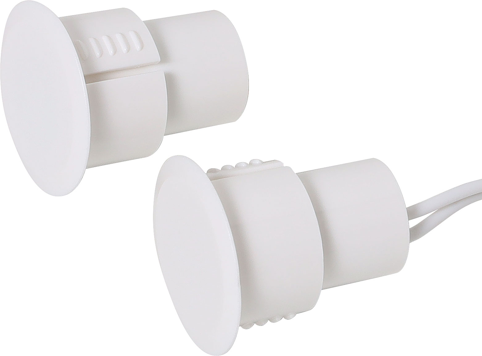 A concealed magnetic reed switch designed for use with metal door frames. Magnetic contact is widely used for alarm systems to detect the state of the door. It consists of a reed switch and a magnet. When the door closes, the magnet interacts with the reed switch, turning it "OFF". When the door opens, the magnet will interact with the reed switch again, turning it "ON" and triggering the alarm.