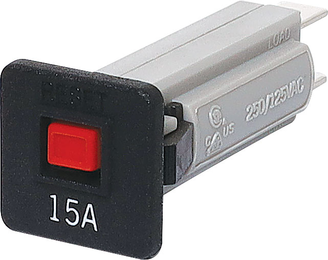 15A circuit breaker. Flush mount style. Snap-in fitting with coloured button. Dimensions: