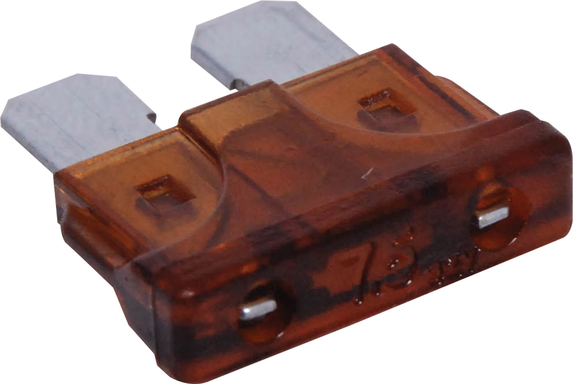 Brown. 7.5A. 5mm blades. 18.7 x 19.1 mm overall size. Standard automotive blade fuse with 32V rating. Suits most automotive blade fuse holders.