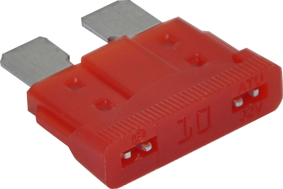Red. 10A. 5mm blades. 18.7 x 19.1 mm overall size. Standard automotive blade fuse with 32V rating. Suits most automotive blade fuse holders.