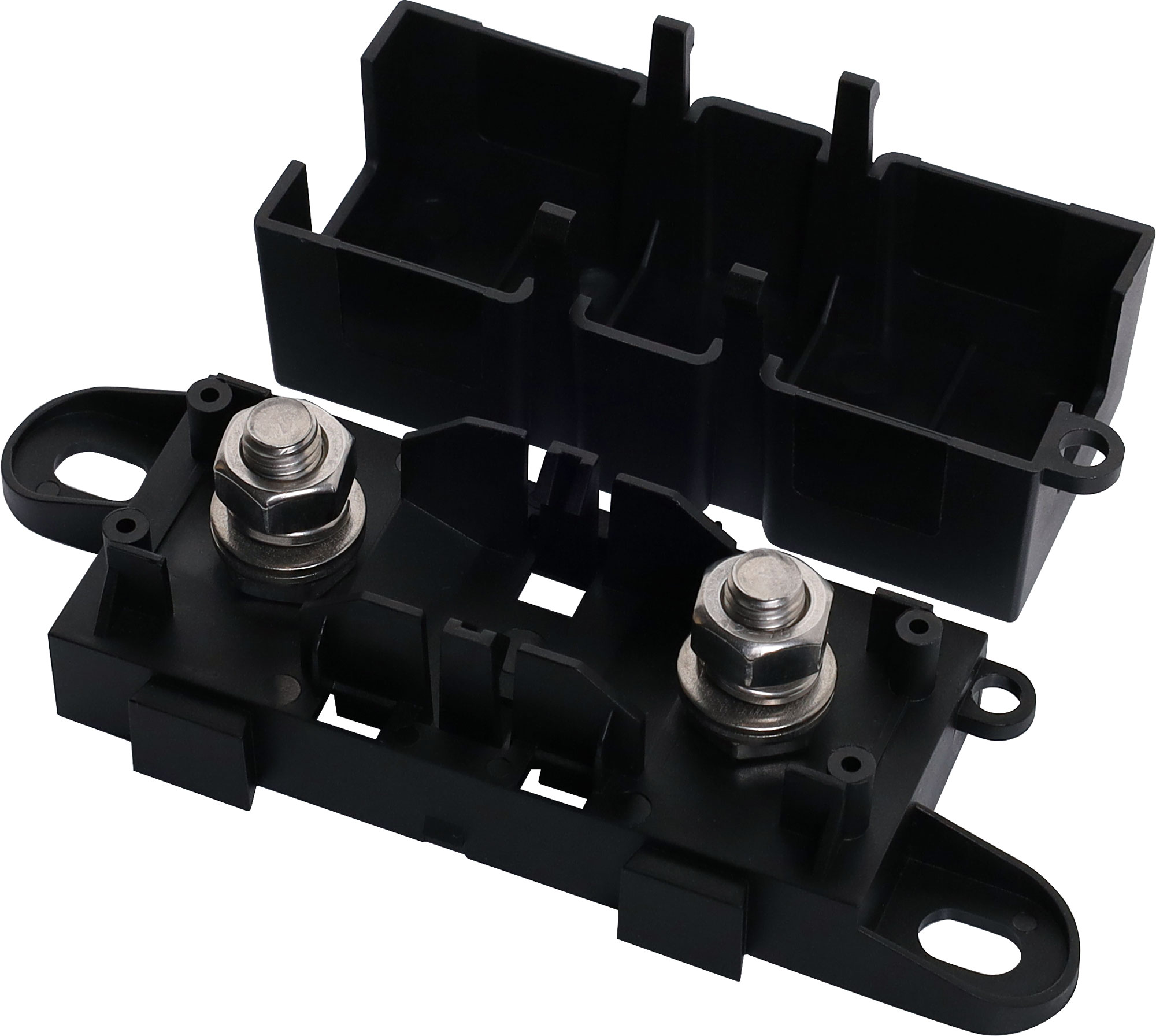 This high current fuse block uses MEGA type fuses. Suits M8 ring terminals. 300A max. Nickel plated connections. Size: 130L x 44H x 36W mm.