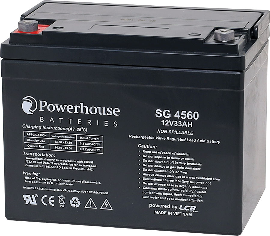 This 12V 33Ah deep cycle battery is a compact battery for powering 12V equipment. Deep cycle sealed lead acid (SLA) batteries are designed for regular discharge. These are suitable for every day use in golf buggies, wheelchairs, forklifts and remote power applications. Fitted with M6 bolt and nut terminals, these batteries are easily user replaced in most equipment they are used in. Cells are fully sealed to prevent any leakage of electrolyte. Our range of Powerhouse SLA batteries are from a quality supplier and are graded for use in commercial systems. We have found the quality of SLA batteries varies considerably between suppliers and often cheaper units have a shorter life span. Excessive temperatures over 65ºC can effect the ABS housing. Need to be well ventilated in warm conditions. Not for use in engine bays.