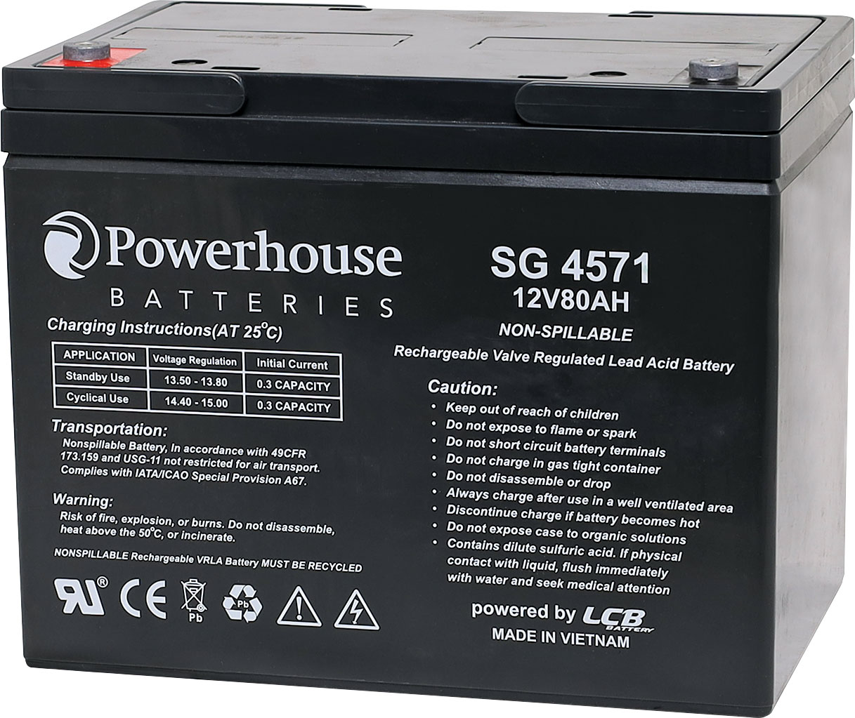 This 12V 80Ah deep cycle battery is a compact battery for powering 12V equipment. Deep cycle sealed lead acid (SLA) batteries are designed for regular discharge. These are suitable for every day use in golf buggies, wheelchairs, forklifts and remote power applications. Fitted with M6 bolt and nut terminals, these batteries are easily user replaced in most equipment they are used in. Cells are fully sealed to prevent any leakage of electrolyte. Our range of Powerhouse SLA batteries are from a quality supplier and are graded for use in commercial systems. We have found the quality of SLA batteries varies considerably between suppliers and often cheaper units have a shorter life span. Excessive temperatures over 65ºC can effect the ABS housing. Need to be well ventilated in warm conditions. Not for use in engine bays.