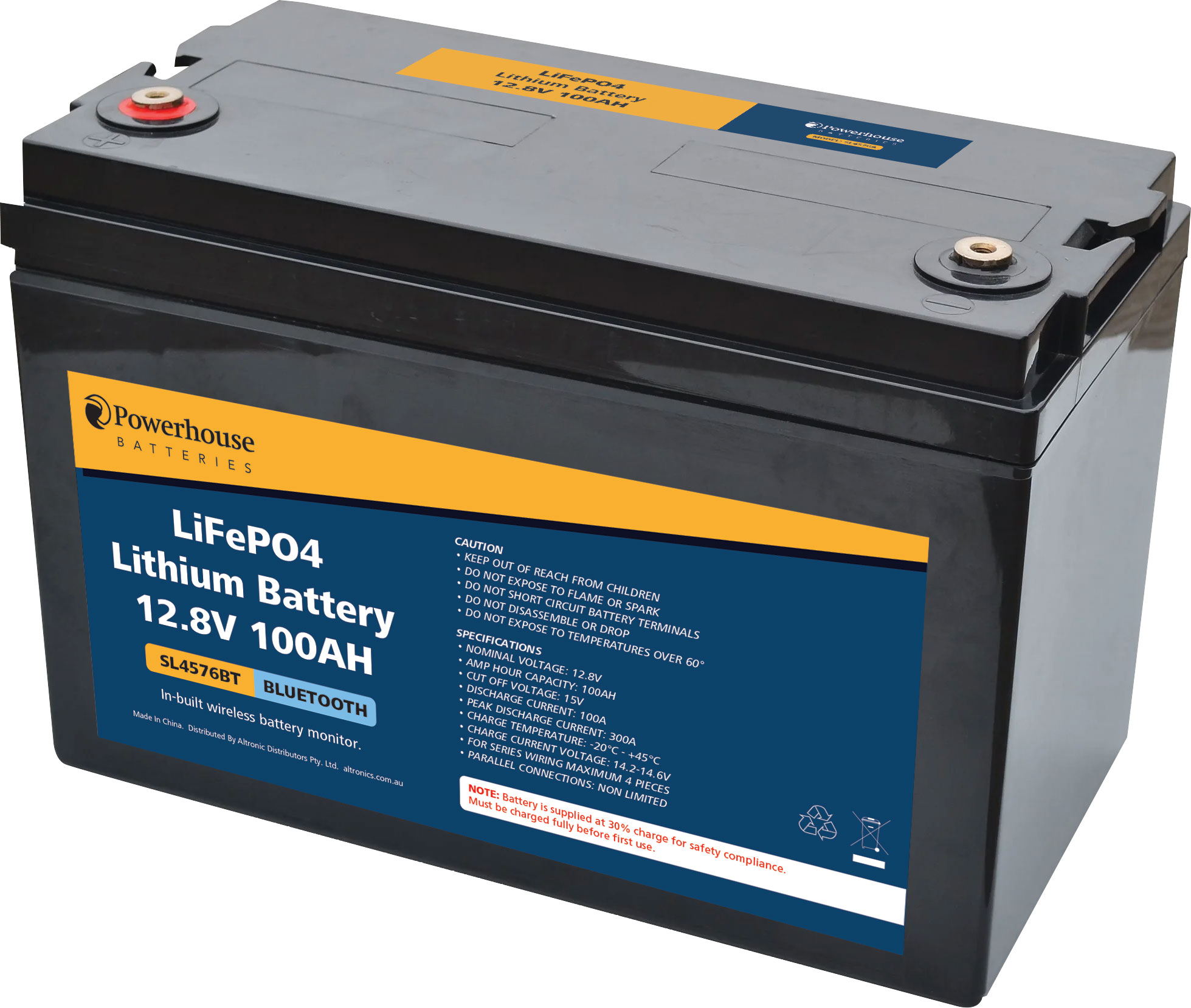 The same great Powerhouse LiFePo4 performance now with added in-built Bluetooth battery monitoring. Pair your battery with your phone and stay up to date with how your battery is charging and discharging as you use it. It offers live stats and historical data via an iOS or Android based app.Β This 12V 100Ah lithium battery (LiFePO4 chemistry) is compatible in size with traditional 90-130Ah SLA batteries, but with all the benefits of cutting edge lithium technology. LiFePO4 batteries offer longer service life than traditional lead acid batteries, plus weigh less than HALF as much as SLA batteries. LiFePO4 also provide more usable life per cycle, allowing for longer run times by holding a higher voltage until capacity is almost exhausted. These batteries will also maintain 80-90% charge when in storage - far higher than their lead acid counterparts. The latest generation in maintenance free batteries is here! Each battery is fitted with an internal battery management system to provide safe charging and discharging at all times. This system provides internal short circuit, over temperature and under/over voltage cut off. Can be wired in series and/or parallel. When used in series each battery will need to be discharged to cut off before connecting so that all cells are all balanced. Factory supplied at 30% charge for safety compliance. Must be charged fully before use. Suitable for recharging with the mains battery charger models listed in the accessories below. Excessive temperatures over 65ΒΊC can effect the ABS housing. Need to be well ventilated in warm conditions. Not for use in engine bays. IMPORTANT NOTE: A fixed installation of this battery in a recreational vehicle such as a caravan, camper or 4WD must adhere to Australian Standard AS/NZS 3001:2. We recommend all customers familiarise themselves with the standards requirements before using these batteries in fixed installations of this type. A professional installer should be consulted when a fixed battery installation is required in a recreational vehicle.