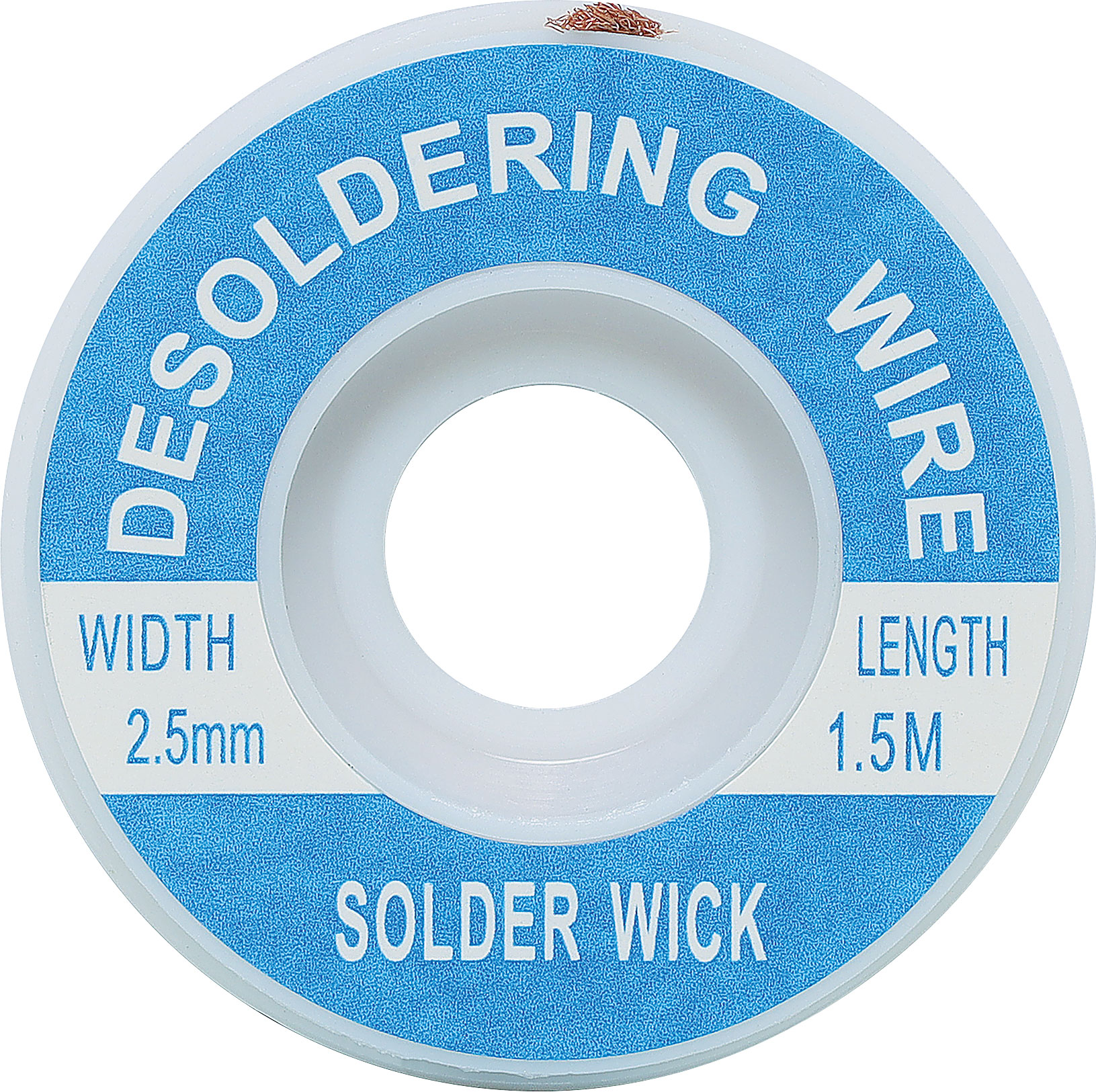 Simply apply this wick to the joint, heat with a soldering iron and the capillary action of the braid will draw the solder off. 2.5mm thickness. 1.5m length.