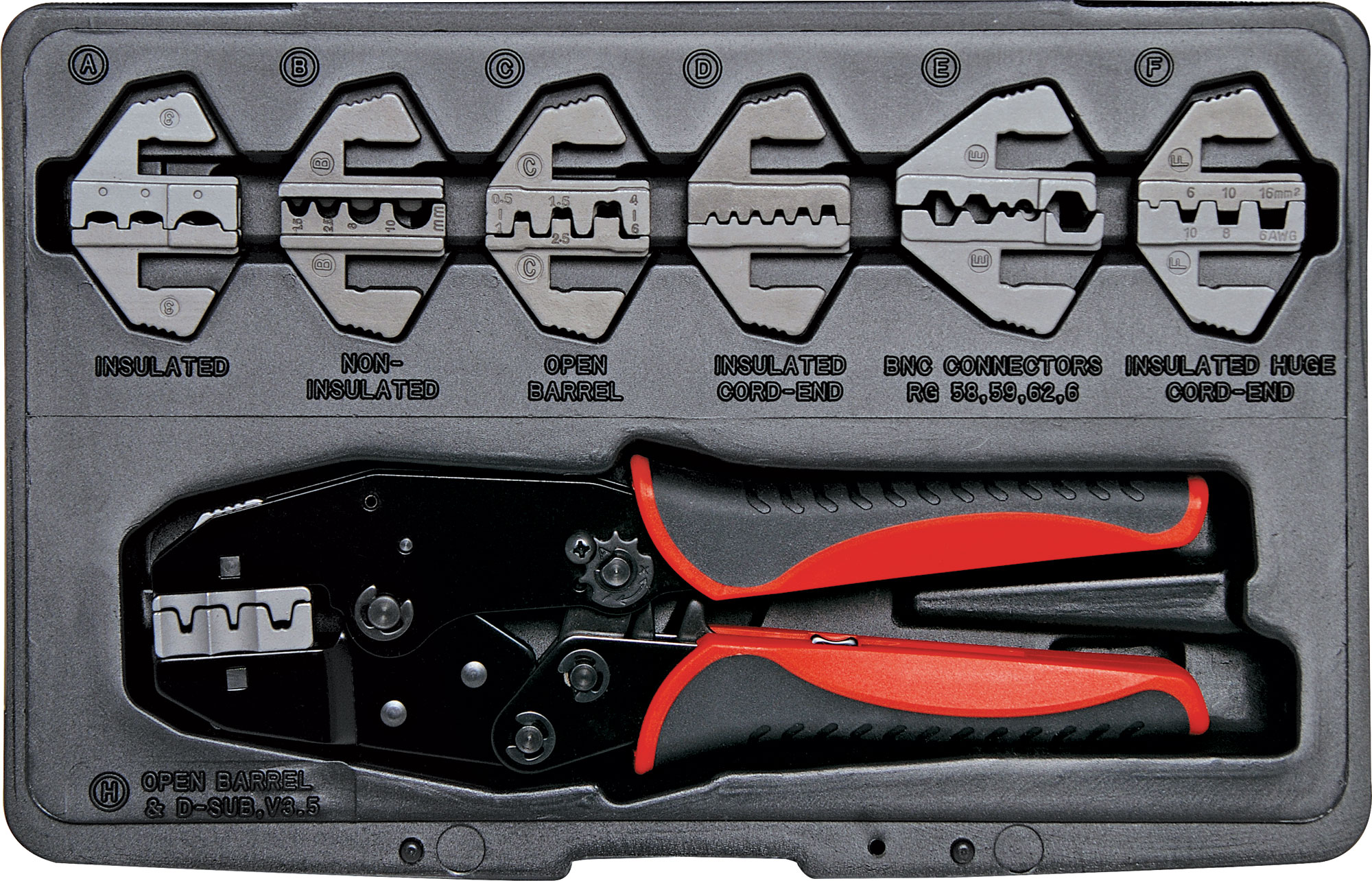 A unique ratchet crimping kit supplied with 7 sets of crimping jaws. Each jaw pair slides into the crimper and is held in place by magnets - no fiddly screws or tricky alignment required. Kit includes jaws to suit insulated kwik crimps, uninsulated lugs,