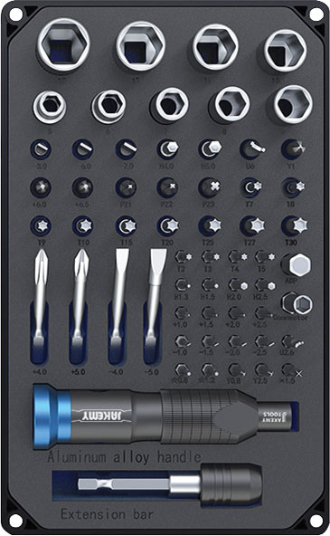 This Professional 60 Piece Driver and Socket Set is ideal for bicycle repair, model disassembly, home assembly, home appliance repair, mechanical maintenance and digital product disassembly. The set contains 47 kinds of matte, chrome-plated screwdriver bits and 9 kinds of matte, chrome plated sockets. The set is enclosed in a magnetic closed box keeping everything neat and tidy. Contains: 4*28mm S-2 bits Torx: T2 T3 T4 T5 Phillips: 1.0 1.5 2.0 2.5 Flat-head (Slotted): 1.0 1.5 2.0 2.5 Hex: H1.3 H1.5 H2.0 H2.5 Pentagon (Pentalobe): 0.8 1.2 Stand off (Mother board): 1.5 U-shape: 2.6 Tri-wing: Y0.8 Y2.5 6.3*25mm S-2 bits Torx: T7 T8 T9 T10 T15 T20 T25 T27 T30 Phillips: 6.0 6.5 Flat-head (Slotted): 3.0 6.0 7.0 Hex: H4.0 H5.0 Tri-wing: Y1 Pozi: Pz1 Pz2 Pz3 6.3*45mm S-2 bits Phillips: 4.0 5.0 Flat-head (Slotted): 4.5 5.0 Socket: M5.0 M6.0 M7.0 M8.0 M9.0 M10 M11 M12 M13