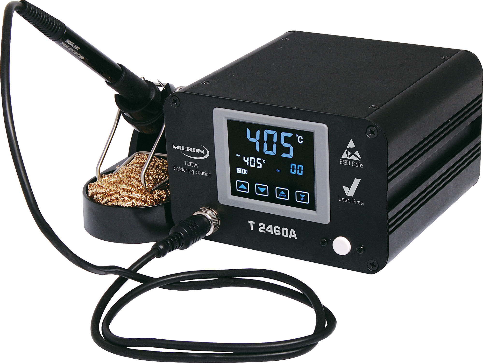 The high power T2460A electronically temperature controlled soldering station with touchscreen incorporates a special intelligent chip microcomputer control design. It has been developed to meet the present and future lead-free soldering needs of the electronic production industry and suitable for work on SMD electronics. The ergonomic handle with a short distance between heating element and tip allows very fast heat up time and quick heat dispersion. The sensor and heat transfer technology employed ensure precise temperature regulation that is essential for making consistent, reliable soldering connections. The temperature is maintained within +/-3°. The handle is fitted with a burn resistant rubber lead. The T2460A enables the user to alter tip temperature from 100 to 500°C without changing tips or heating elements. The LCD touchscreen provides instant readout of temperature and allows quick selection of settings. The many features of the T2460A make it the ideal tool for service and repair technicians as well as production line soldering operations. The “Zero Voltage” electronic switching design also protects voltage and current sensitive components (CMOS devices. etc.) against damaging current and transient voltage spikes/ The power unit is isolated from the AC line by a transformer and allows only 32V AC to drive the heating element. Package Includes: Soldering station Soldering iron handle Iron stand Dry tip cleaner 1mm tip Mains connection lead