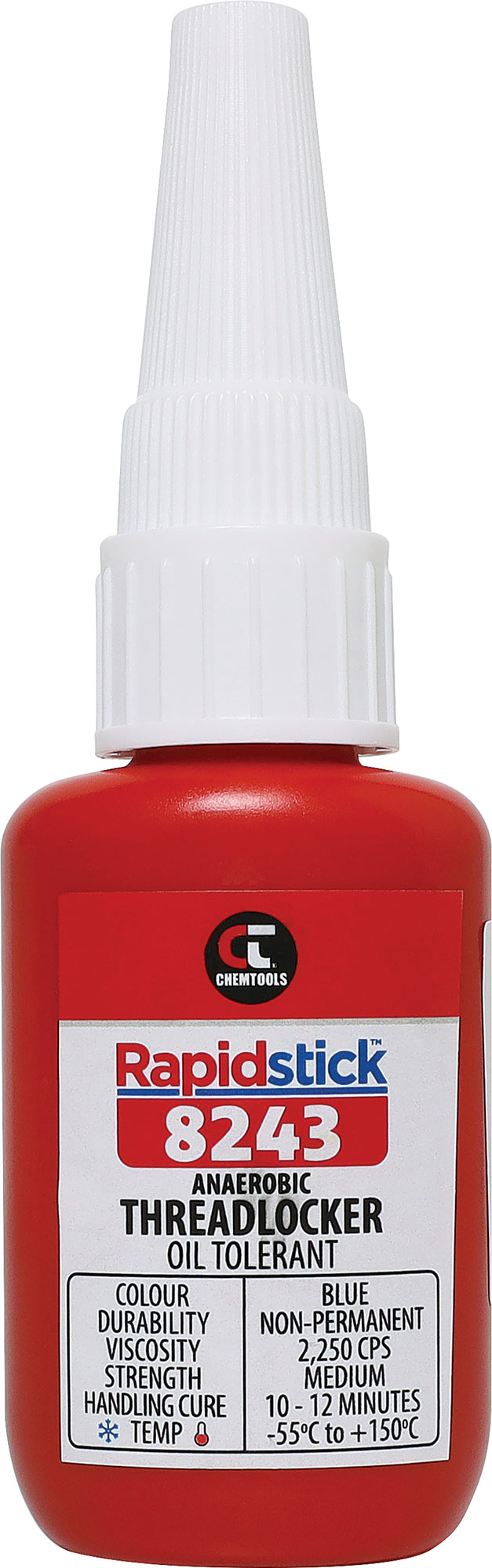 The 10ml tube of Chemtools RapidStick 8243 removable general-purpose thread-locking adhesive, equivalent to Loctite 243, is suited for stainless steel fasteners between 6-19mmØ. It is tolerant of oil and other contamination and protects threads from rust and corrosion.