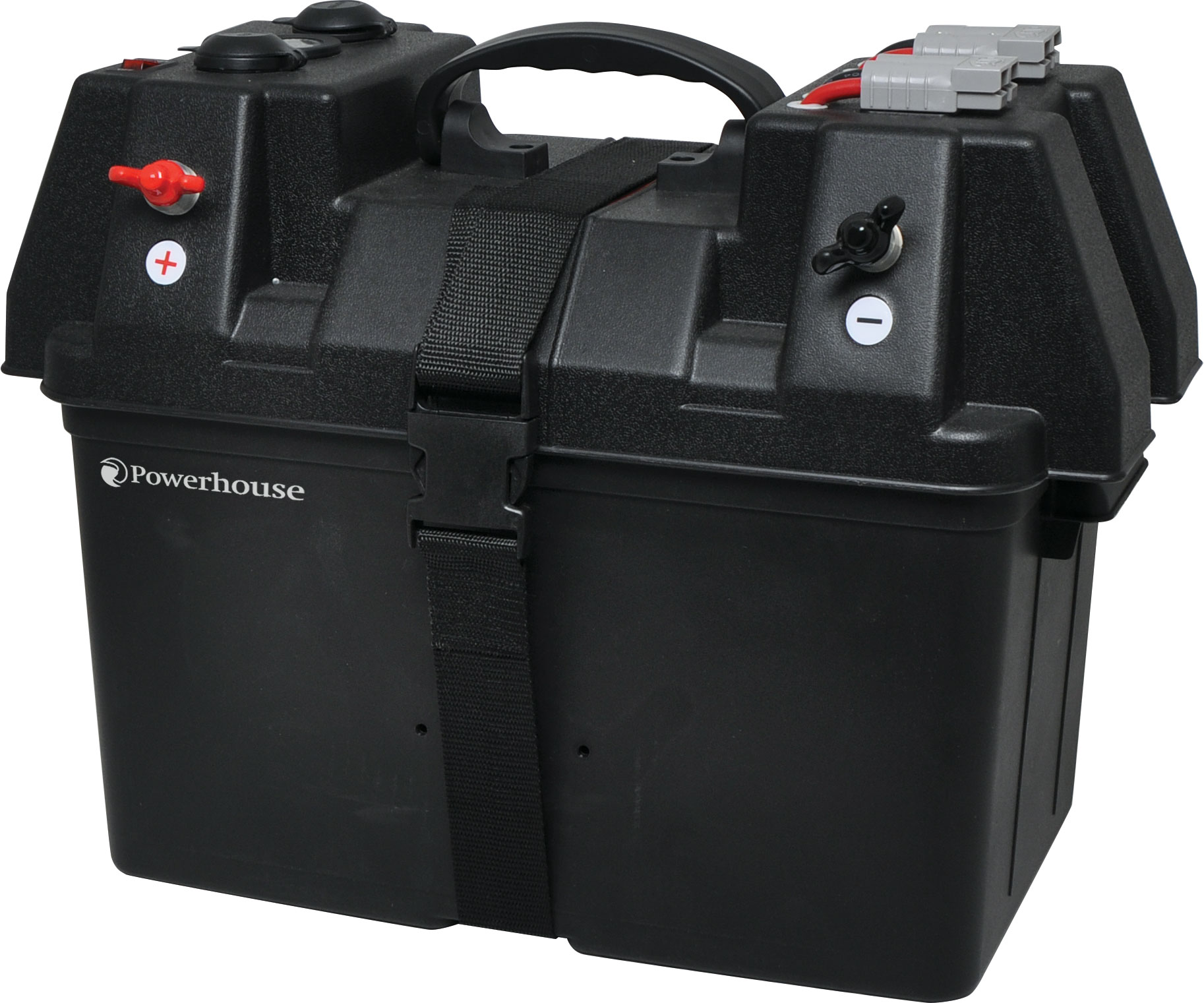 This 12V portable battery box features all the common connections that would typically be required for outdoor recreation power needs. It is capable of holding a deep cycle battery up to 100Ah (sold separately), which can be secured in place with the supplied webbing strap. Once fitted with a battery, the box can be used to power campsite equipment and connected to a solar panel for recharging. The box comes with carry handles so itβs easily portable and is fitted with a variety of connections for powering your portable appliances. These include two 50A Anderson plugs, insulated bolt terminals (fitted with wing nuts) and a 12V car accessory socket with over current protection in-built. For smaller devices such as phones and tablets two USB ports are provided with up to 2.4A charging current. Itβs also fitted with a voltmeter to help monitor the battery level. Not all battery boxes are the same! Our Powerhouse unit has some key features that are not found on many models in the Australian market: - 2 x 50A maxi blade fuses in circuit for extra protection. - Lid with dual side clips for extra secure fit. - High current output USB ports (2 x 2.4A) to charge high capacity devices such as tablets. - Bar graph style LED volt meter.