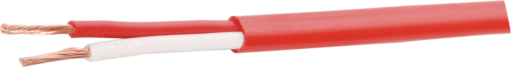 Speaker cable for 100V line commercial PA audio systems. Double PVC insulated twin. Separate conductors with non-bonded sheath. Voltage rating: 600V AC Current rating: 14 Amps Dimensions: ≈ 9.4 x 5mm Conductor area: 1.4mm2 Conductor gauge: AWG Temperature rating: 75C Roll size: 300m