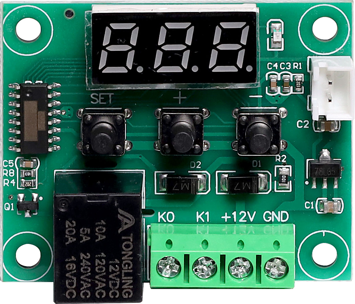 This high precision temperature control module is a highly functional self-contained temperature controller module for both heating and cooling applications. The module measures and displays the temperature and allows you to control power to most types of electrical equipment based on that temperature. A single output relay can be turned ON or turned OFF as temperature rises or lowers past a thermal threshold that you set. You can also set a temperature hysteresis, relay activation delay and thermal limits for the modules operation.