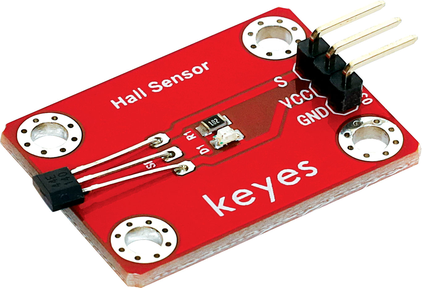 Utilises the 44E hall effect sensor for contactless magnetic switching. Output drops to ground when triggered. 3.3 ~ 5V DC input. Size: 36 x 22 x 7mm