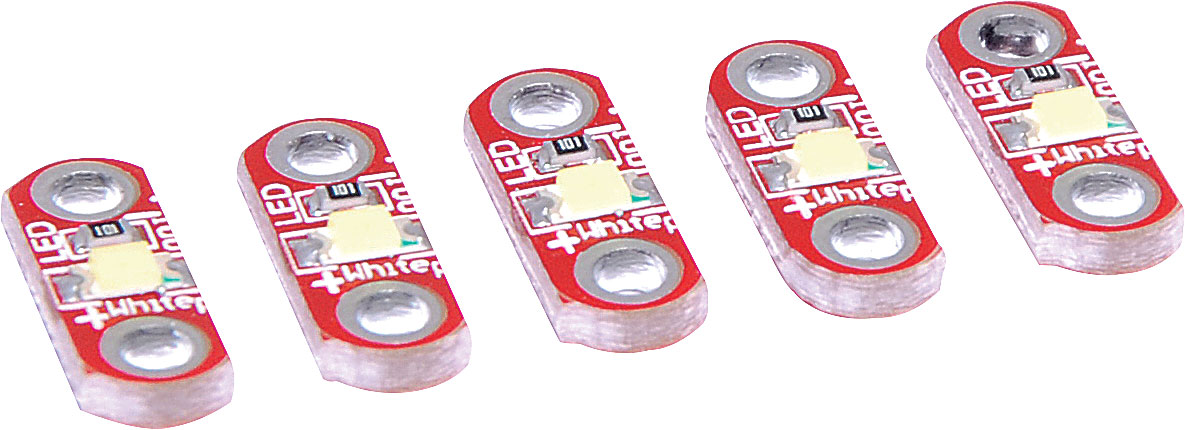 White SMD LED sequins in packs of 5pcs. Ideal for creating e-textile projects with Arduino ''Lilypad''. 5V DC 40mA input. Size: 12.7W x 5.2H x 2.2Dmm.