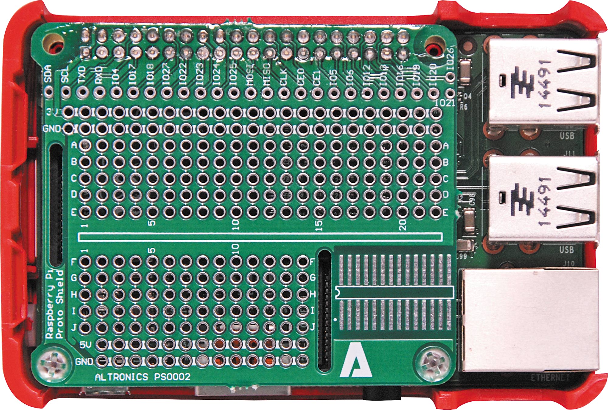 A prototyping HAT that fits inside the official Raspberry Pi case! Featuring solder masked 0.1” holes, 28 SMD IC area, a 40 pin header (unsoldered) and slots for display & camera cables. Comes supplied with header, PCB and hardware. Please Note: The Raspberry Pi board and case have been used for illustration purposes only and are not included.