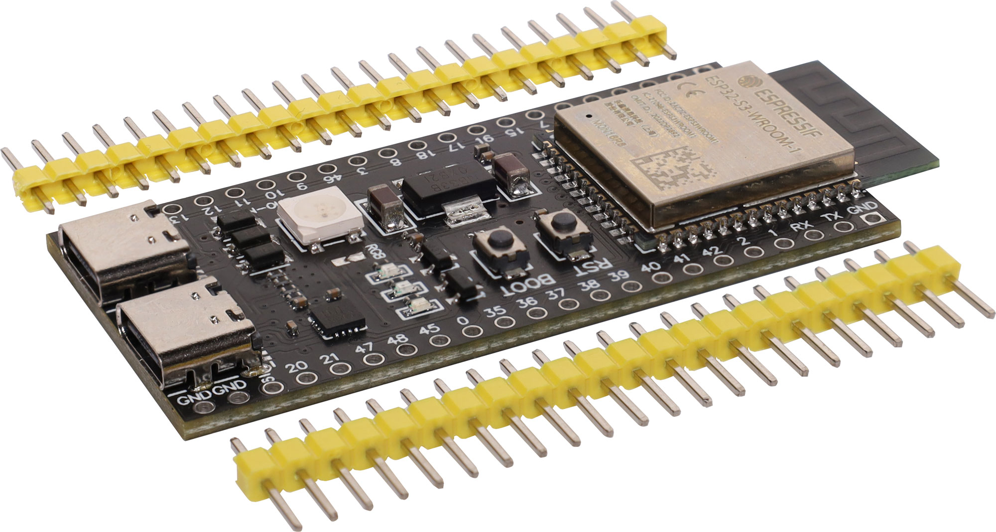 The ESP32-S3 development board is assembled with an original ESP32-S3-WROOM-1 module from Espressif, with 16MB Flash and 8MB PSRAM(ESP32-S3-WROOM-1-N16R8). It is a general-purpose Wi-Fi + Bluetooth® LE MCU module that integrates complete Wi-Fi and Bluetooth LE functions.